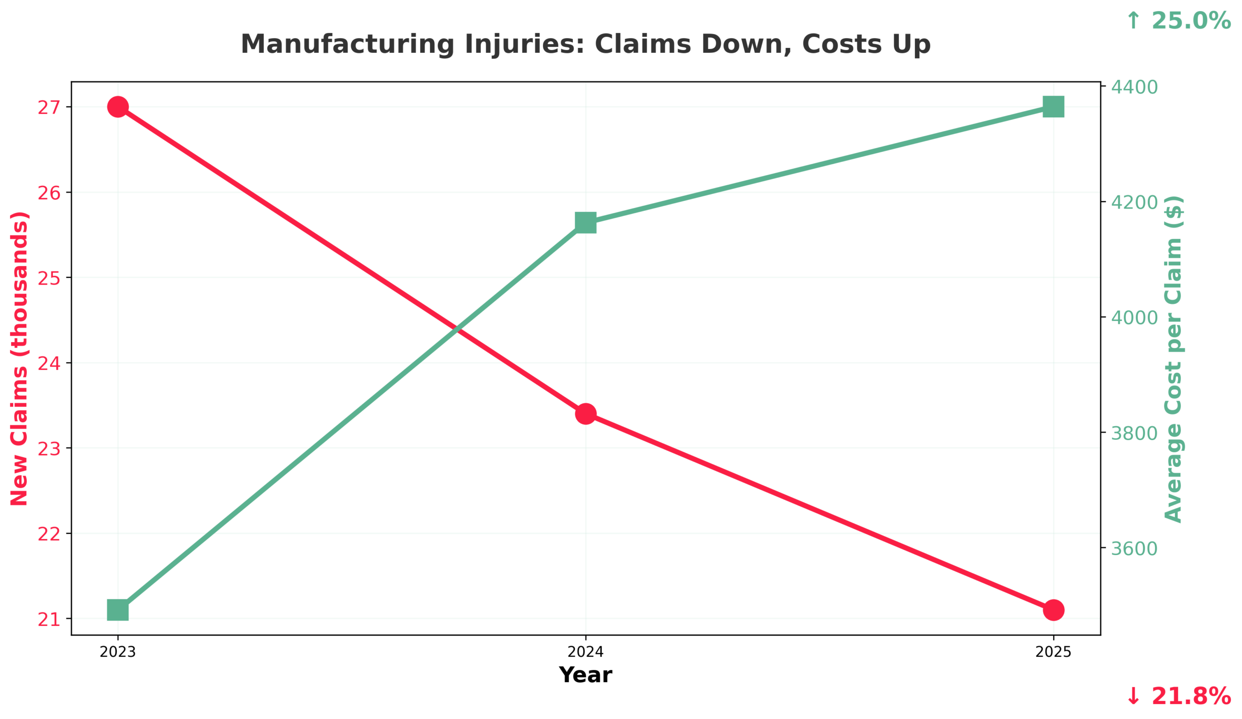 Across the period from 2023 to 2025, the data shows a consistent pattern. New injury claims are declining, but the cost of managing each claim continues to rise.