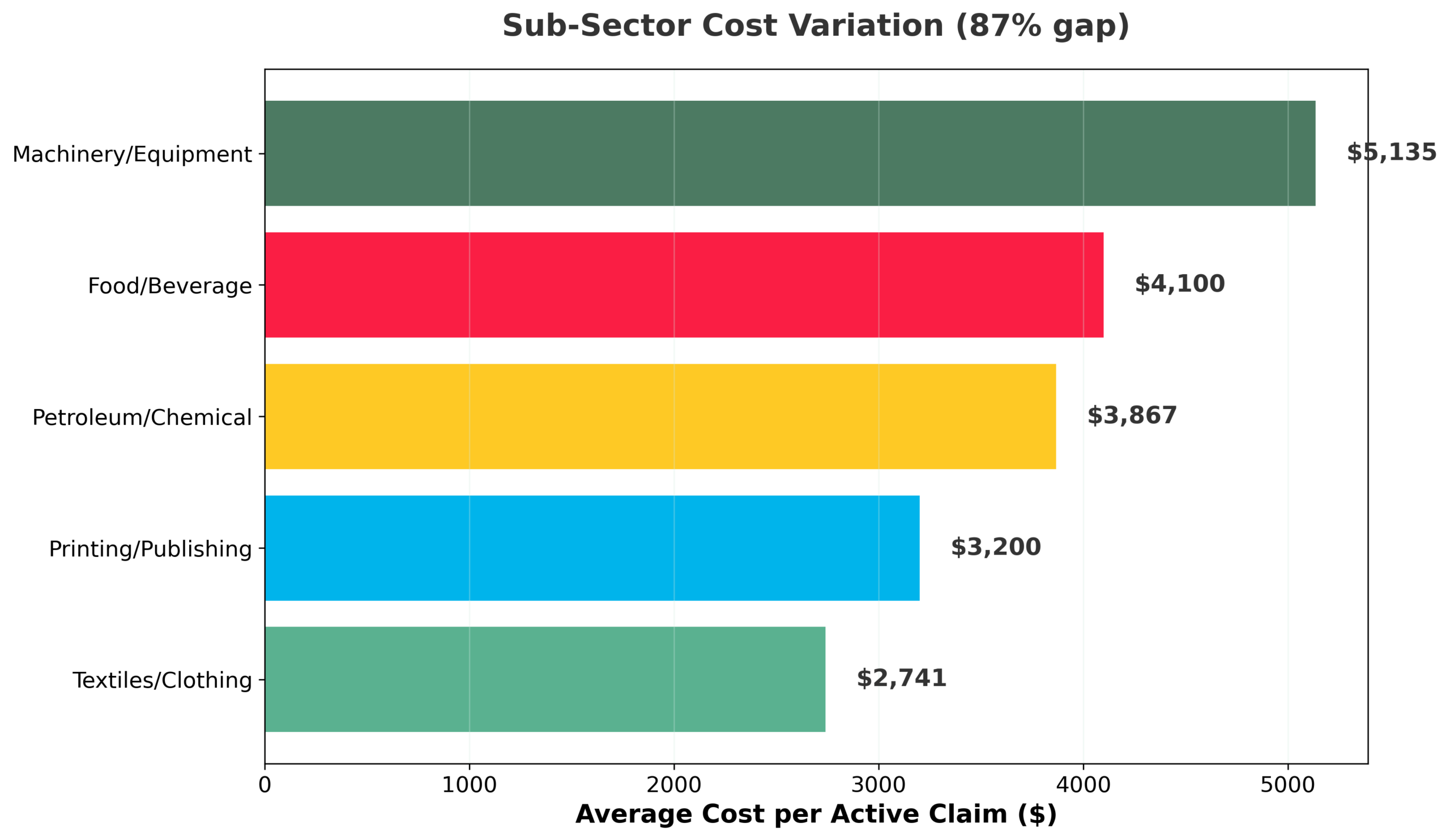 In 2025, the average cost per active claim ranged from $2,741 in Textile, Clothing, Footwear & Leather to $5,135 in Machinery & Equipment —an 87.3% gap.