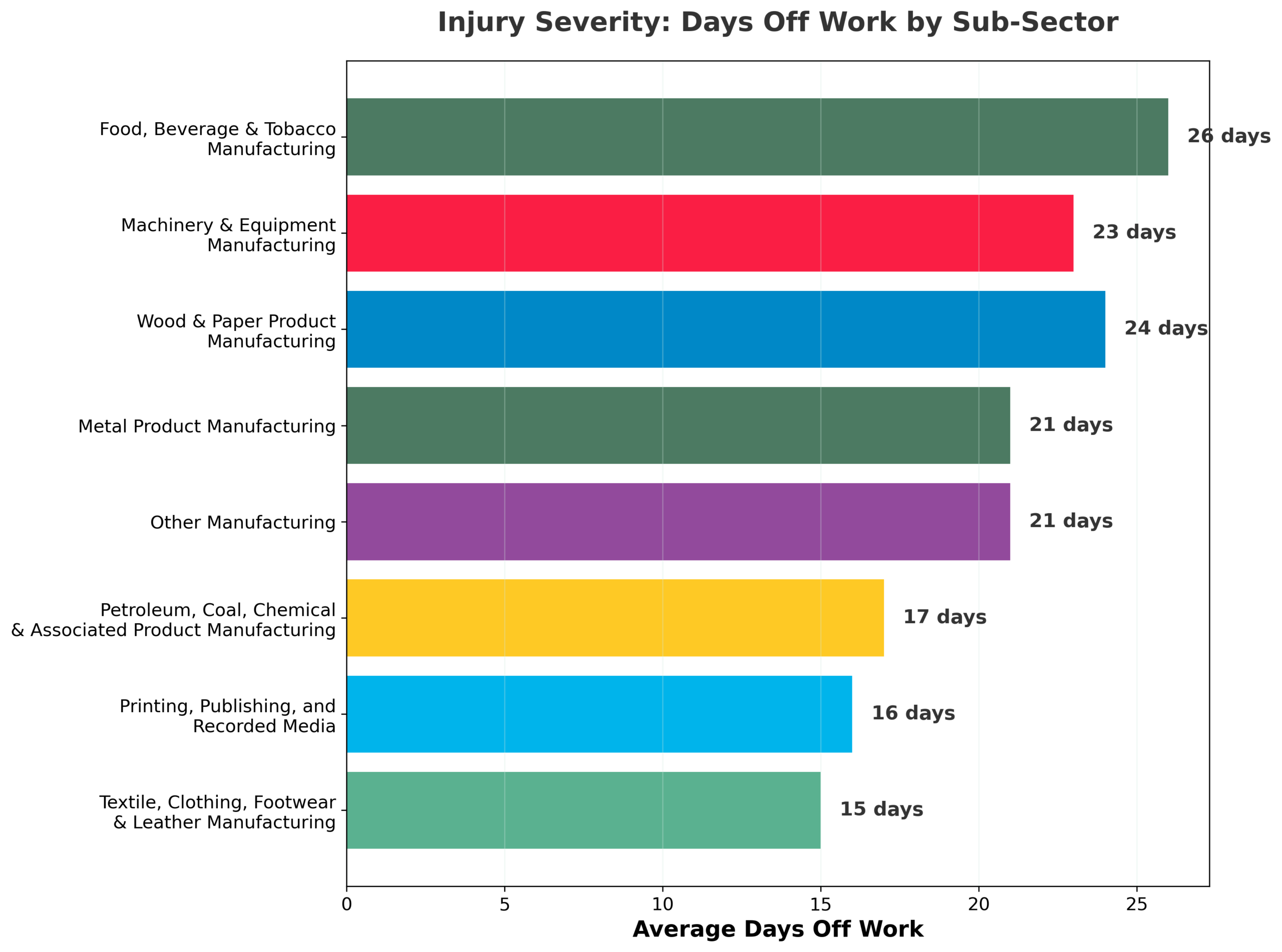 Food, Beverage & Tobacco generated the most total days off (233,136) and the longest average absence (29 days), while Printing, Publishing and Recorded Media had the shortest (17 days) (ShopCare, 2025b).